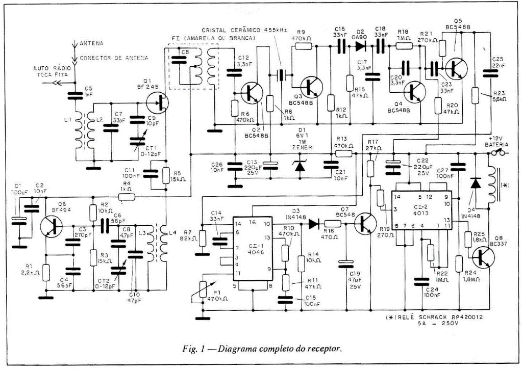 O circuito receptor é do tipo super-heteródino onde Q1 atua como misturador e 06 como oscilador cuja frequência deve ser ajustada de modo que ao se combinar com a frequência do transmissor tenhamos a frequência intermediária de 455 kHz.