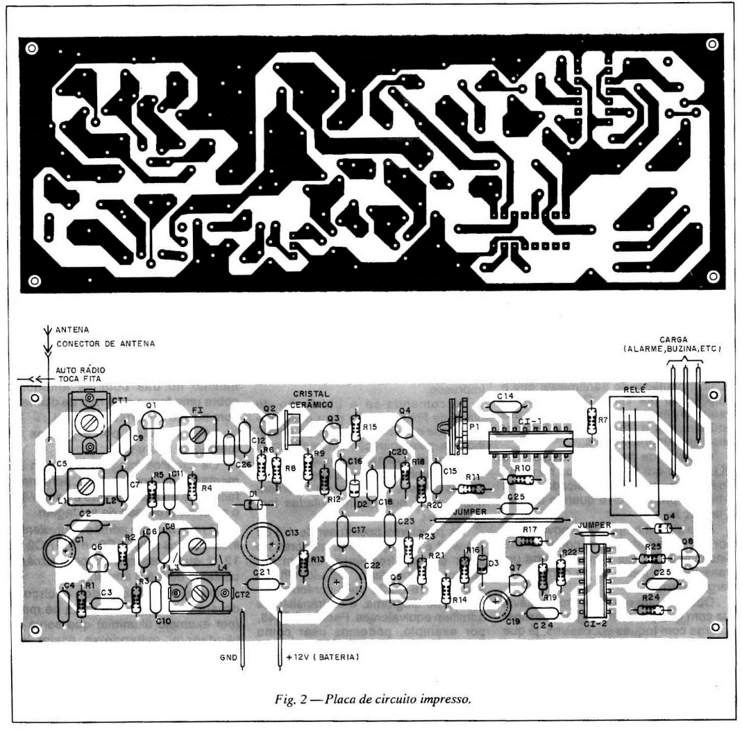 Na figura 2 temos a disposição dos componentes numa placa de circuito impresso. Recomenda-se a utilização de placa de fibra de vidro para maior estabilidade de funcionamento do aparelho que, pela operação em frequências algo elevadas tem seus pontos críticos.