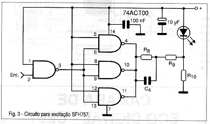 Para o SFH757 temos, na figura 3, um circuito prático de aplicação onde portas NAND separadoras são usadas na excitação a partir de sinais lógicos de entrada.