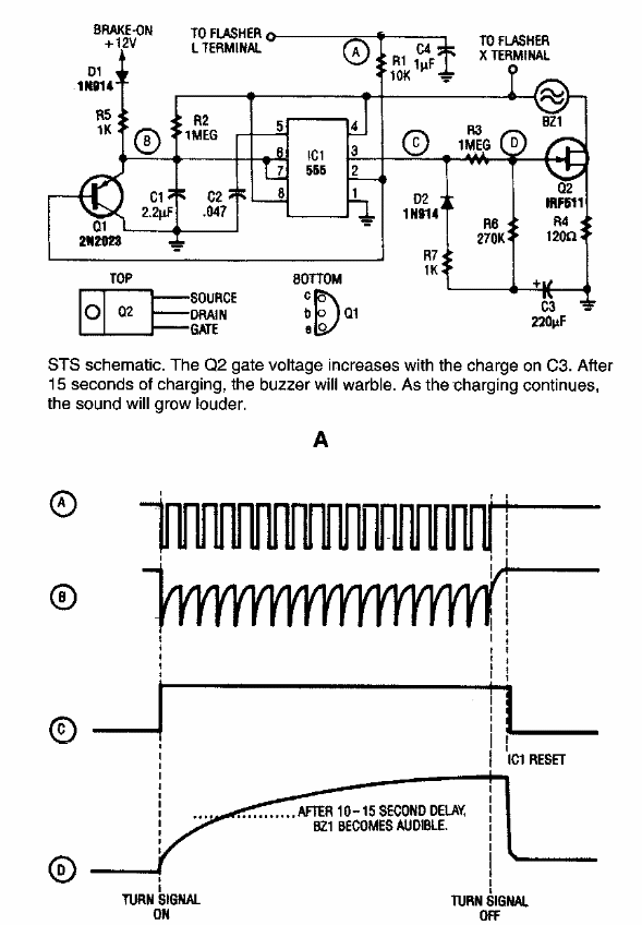 Este circuito de uma Electronics Now dos anos 90 produz um sinal inteligente de seta que tem duração controlada. Os componentes são comuns ainda em nossos dias, alguns admitindo equivalentes.