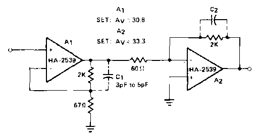 Encontrado numa documentação da Harris dos anos 90, este circuito tem um ganho de 60 dB em 20 MHz. Podem ser usados amplificadores operacionais equivalentes. A fonte deve ser simétrica.