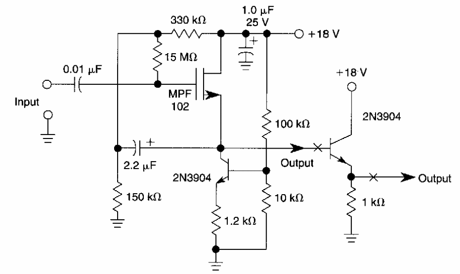 Encontrada numa documentação americana dos anos 90, esta etapa com JFET tem uma impedância de entrada de 500 M ohms. Os transistores bipolares são de uso geral e o FET admite equivalente.