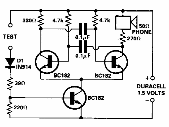 Sugerido por uma Electronic Engineering dos anos 90, este circuito serve para testar a continuidade de trilhas em placas de circuito impresso. O circuito é alimentado por uma única pilha.