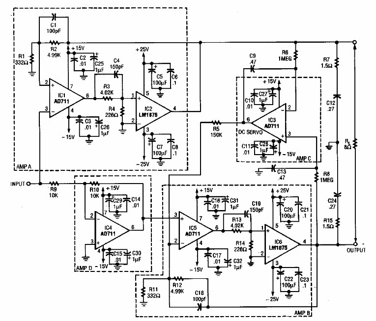 Encontrado numa Electronics Now dos anos 80, este amplificador também pode ser visto em amplificadores comerciais da época. O integrado usado é pouco comum em nossos dias. A potência é de 33 W.