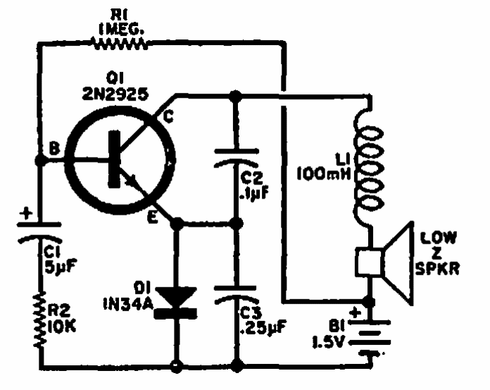 Este circuito de uma Popular Electronics alimenta um pequeno alto-falante. O transistor pode ser de uso geral e os capacitores podem ser alterados para mudar o som gerado.