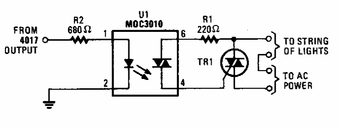 Originalmente sugerido por uma Popular Electronics para controlar lâmpadas de natal, este circuito pode perfeitamente encontrar aplicação como um shield. O valor de R2 será alterado conforme a saída do microcontrolador.