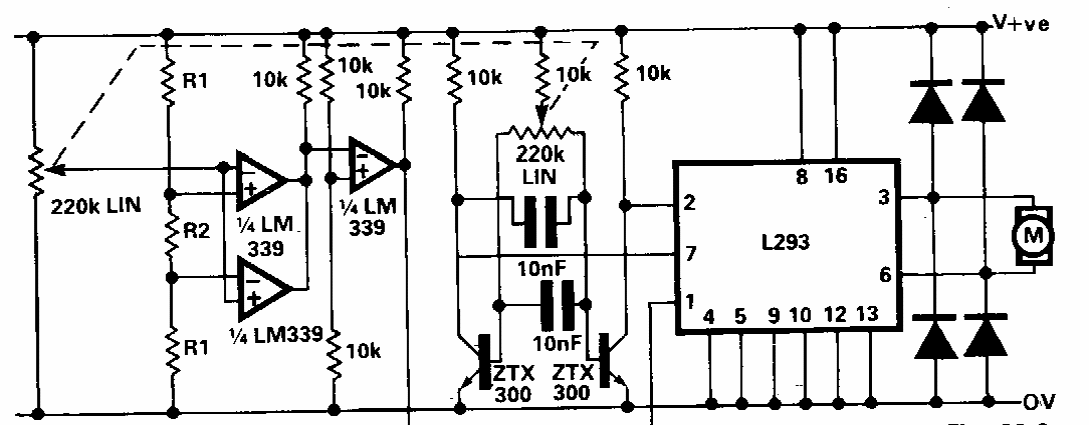 Este controle para motores até 1 A foi encontrado numa documentação da Siliconix usando um componente próprio. O circuito é do tipo PWM.