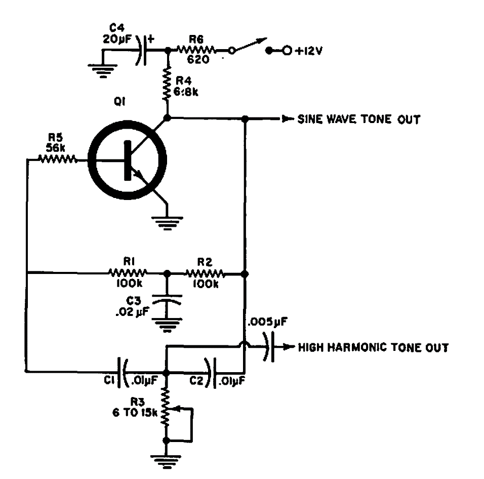 Este circuito foi encontrado numa Electronics World de 1968. O transistor pode ser qualquer um de uso geral e o duplo T deve ser ajustado em R3 para o efeito desejado.