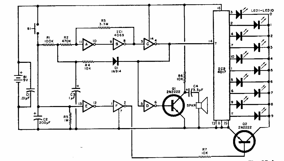 Encontrado numa Popular Elecronics dos anos 90, este circuito aparece em outras versões nesta seção e no site. O circuito sorteia um de 10 LEDs e tem um efeito sonoro produzido durante o sorteio.