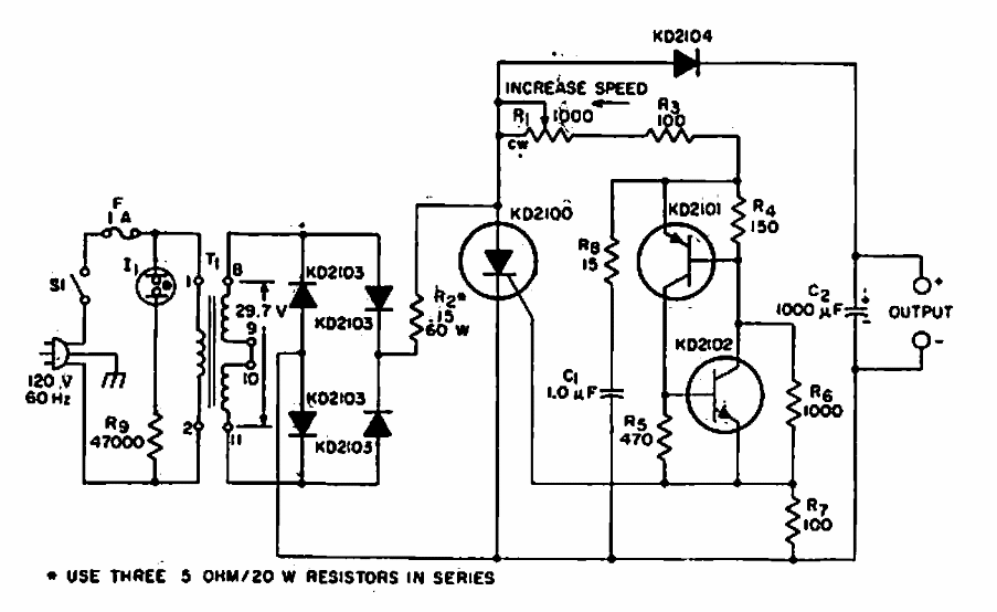 Este circuito é de um manual de SCRs da RCA de 1967. O circuito faz uso de componentes da época que podem ser substituídos por equivalentes modernos. O transformador é de 12 V x 1,2 A.
