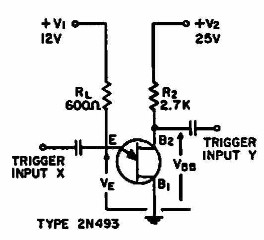 Obtido em documentação da General Electric este circuito consiste num biestável com unijunção. Observe as duas tensões de alimentação. O circuito é indicado para aplicações com osciloscópios da época.