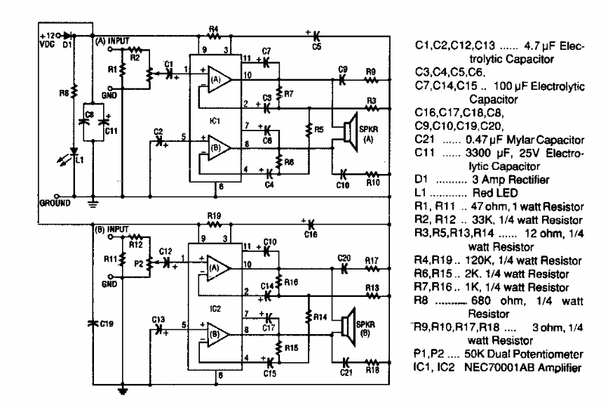 Encontrado numa publicação americana dos anos 80, este circuito pode ser encontrado em equipamentos de som comerciais da época. A lista com os valores dos componentes é dada ao lado do diagrama.