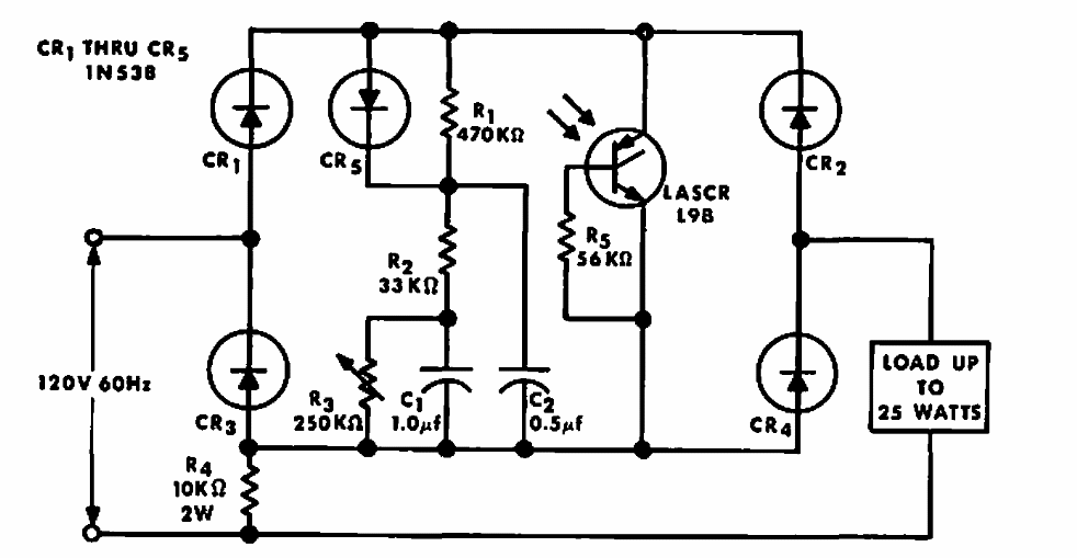 Este circuito foi sugerido pela General Electric em documentação de 1970. Ele faz uso de um foto-SCR ou LASCR, componente pouco comum atualmente.