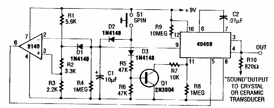 Este circuito encontrado numa Radio Electronics pode ser usado em jogos para produzir um trem aleatório de pulsos. O circuito integrado principal não é um componente comum atualmente. O circuito tem um ciclo de frequência decrescente de 15 segundos.