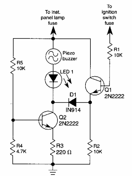 Este circuito dispara um buzzer com oscilador se a chave de ignição for retirada com os faróis acesos. O circuito é de um Experimenter Handbook de 1989. Os transistores usados ainda são comuns.