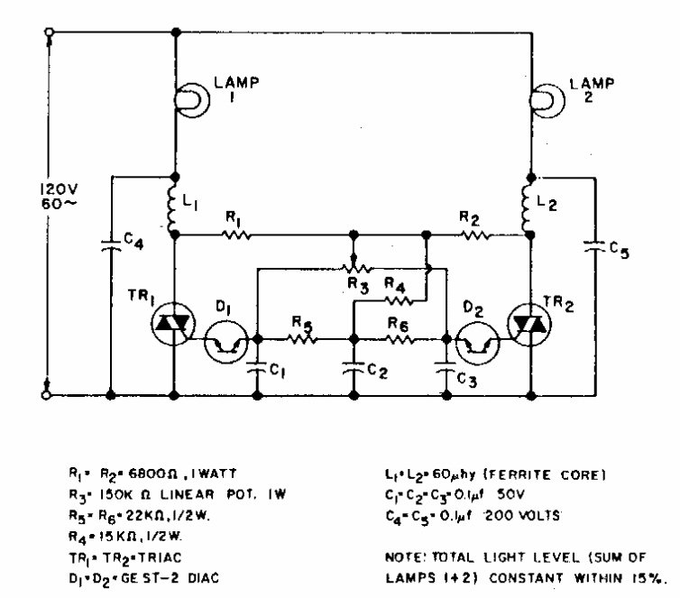 Este Cross-Fader como também é conhecido faz com que o brilho de uma lâmpada aumente ao mesmo tempo em que o brilho da outra diminui. O circuito é de uma documentação dos anos 90 da General Electric. Triacs equivalentes e SBS podem ser usados.
