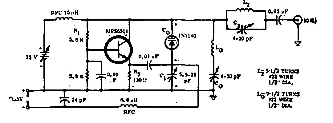 Usando um varactor ou varicap, este circuito de uma Electronics World de 1969 tem uma faixa de modulação de 75 kHz até 52 MHz. Componentes equivalentes modernos podem ser usados.
