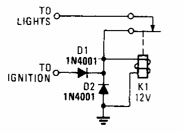 Este circuito é acionado pela chave de ignição que, quando retirada faz um relé apitar se as luzes estiverem acesas. Veja que neste circuito, o próprio relé usado como oscilador. O circuito é de uma Popular Electronics dos anos 90.