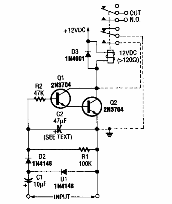 Na figura temos o circuito de disparo para um relé com sinais de áudio. O circuito é de uma Radio Electronics dos anos 80. O relé é do tipo sensível de 12 V. Para disparo com microfone use o circuito seguinte.