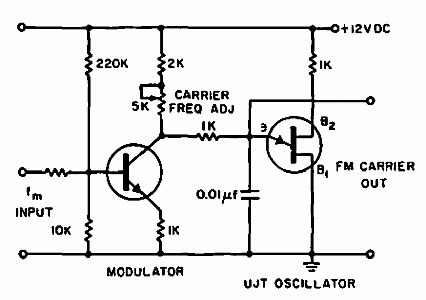 Este oscilador produz um sinal modulado utilizado transistor unijunção. Encontramos em uma documentação americana de 1965. O circuito modula em frequência o sinal gerado.