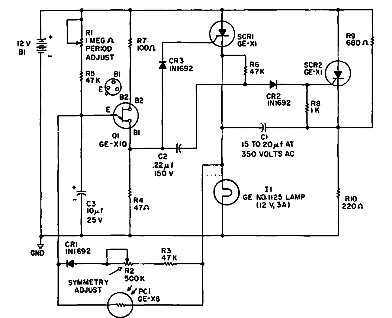 Este circuito foi encontrado numa documentação da General Electric de 1965. Os SCRs e o unijunção podem ser equivalentes atuais. O circuito tem ajuste de período e simetria.