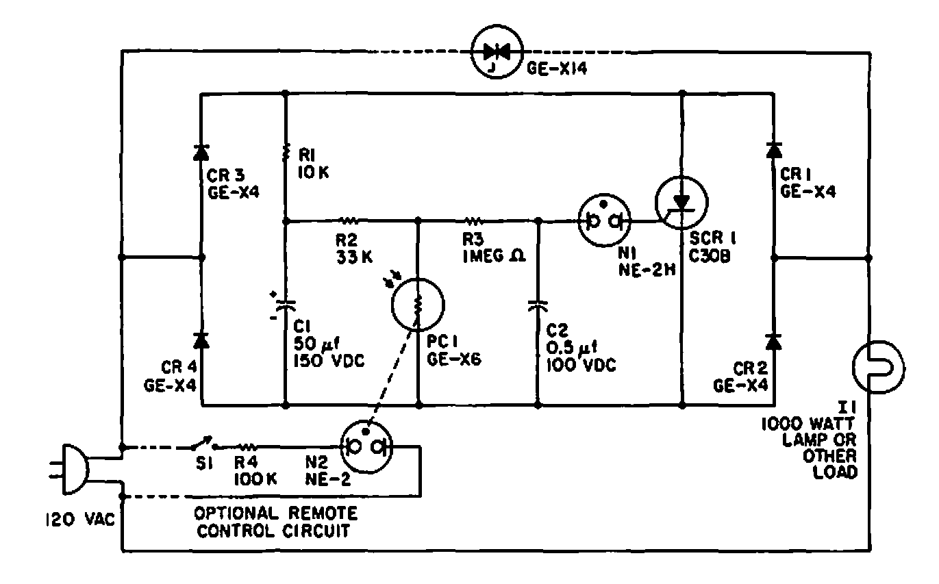 Sugerido pela General Electric em documentação de 1965, este flasher tem um circuito de controle com um acoplador óptico com lâmpada neon e LDR O circuito é para lâmpadas incandescentes.