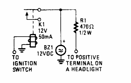 Encontrado numa Popular Electronics este circuito aciona um buzzer se a chave de ignição for retirada com os faróis acesos. O buzzer pode ser substituído por um oscilador.