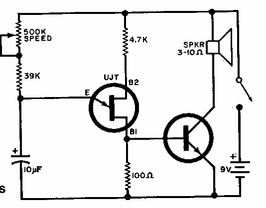 Encontrado numa Popular Electronics dos anos 90, este circuito faz uso de um 2N2646 e um transistor de uso geral como o BC548. O potenciômetro pode ser de 470k.