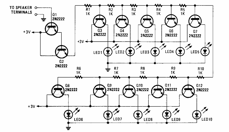 Este circuito foi encontrado numa Popular Electronics dos anos 80. Os componentes usados são comuns e o número de canais de indicação (LEDs) pode ser alterado.