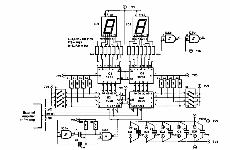 Encontrado numa antiga Elektor este circuito usa dois displays de 7 segmentos para indicar o volume de um amplificador. O circuito usa componentes que ainda são comuns em nossos dias.