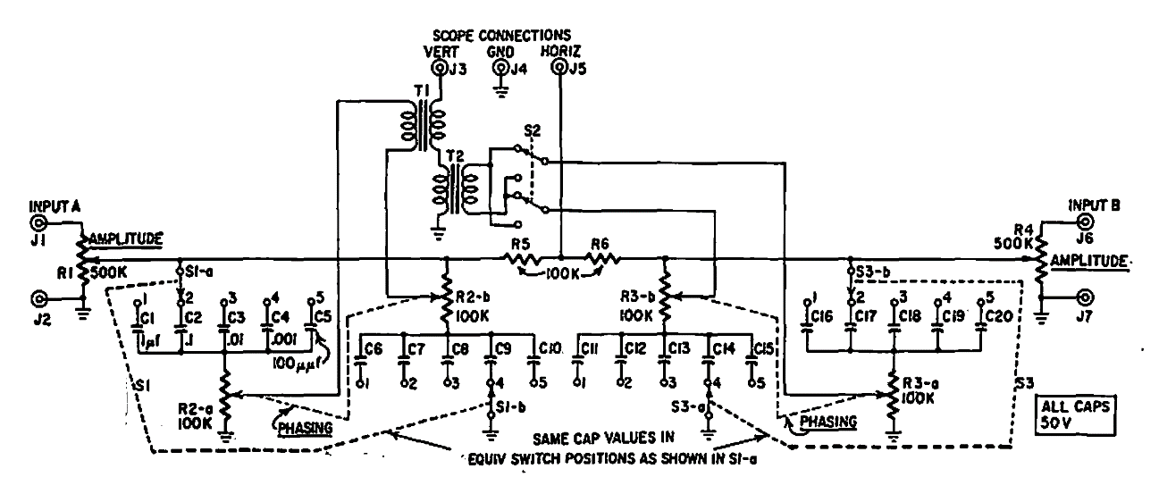 A finalidade deste circuito de uma Radio Electronics de 1965 é ajudar na observação de formas de onda cicloide em um osciloscópio. O circuito usa apenas componentes passivos.