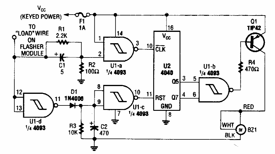 Este circuito foi obtido numa Popular Electronics dos anos 90. Ele avisa quando a seta for esquecida ligada acionando um alarme sonoro. O alarme usada é do tipo Sonalert da época.