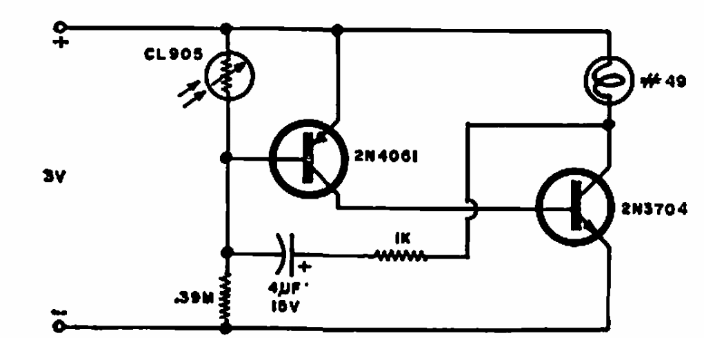 Este circuito foi obtido numa Electronics World de 1968. Os transistores podem ser equivalentes como o BC558 para o PNP e o BD135 para o NPN alimentando lâmpadas de 3 a 12 V conforme a alimentação.