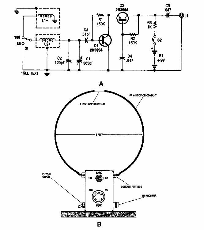 Encontrado numa Popular Electronics dos anos 80, este circuito pode usar transistores mais modernos como os BF494 ou BF495. O circuito opera nas faixas de radioamadores de 160 e 80 metros, podendo também ser usado nas faixas de ondas médias.