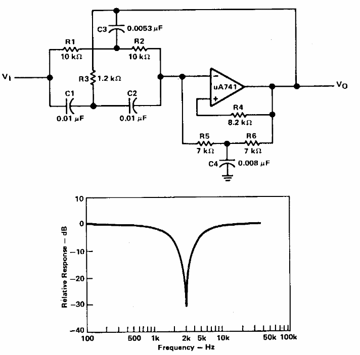 Este filtro foi encontrado numa documentação da Texas Instruments dos anos 80. O circuito usa um operacional comum e tem na figura sua curva de resposta.