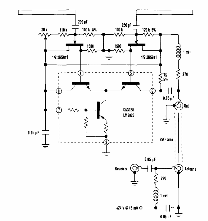 Este circuito foi obtido numa Electronic Design dos anos 90. O circuito usa transistores da época e um integrado que consiste num array de transistores. Podem ser experimentados transistores discretos atuais equivalentes.