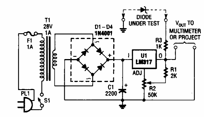 Encontrado numa Popular Electronics dos anos 90, este circuito tem por finalidade encontrar a tensão de um diodo zener até 20 V aproximadamente. O transformador pode ter corrente menor.
