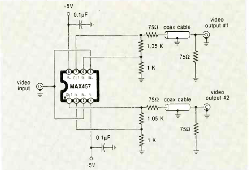Este circuito para sinais de vídeo analógico foi encontrado na revista Radio Electronics de agosto de 1970. O circuito é usado para excitar duas entradas de vídeo a partir de um sinal.