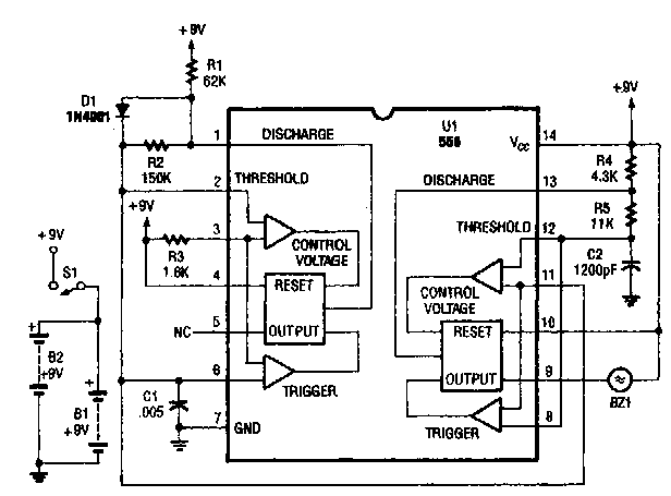 Este circuito foi encontrado num PE Hobbyst Handbook de 1992. O segundo oscilador é um VFO. O circuito usado é um duplo 555 da época.