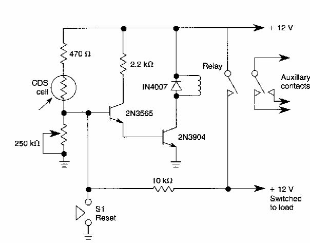 Este circuito foi sugerido por documentação americana dos anos 90. Os transistores são de uso geral. O relé deve ser do tipo de contatos duplos para utilização como trava.