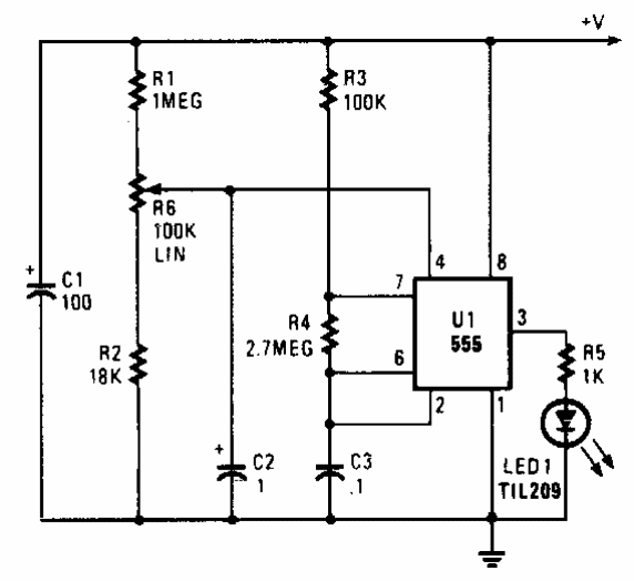 Na presença da tensão de alimentação de um circuito de 3 a 12 V, este circuito faz com que o LED pulse, na razão de uma piscada a cada vários segundos ajustados em R3. O circuito é de uma Popular Electronics dos anos 90.