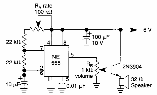 Esta é uma das muitas configurações possíveis de metrônomo usando o 555. Encontramos numa Electronics Now dos anos 90. O transistor pode ser qualquer de uso geral. Para maior potência alimentado com 9 ou 12 V use o BD135.