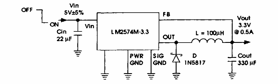 Encontrado em publicação da National Semiconductor, este circuito fornece uma tensão de saída de 3,3 V, ideal para alimentação de microcontroladores. A corrente máxima é de 500 mA.