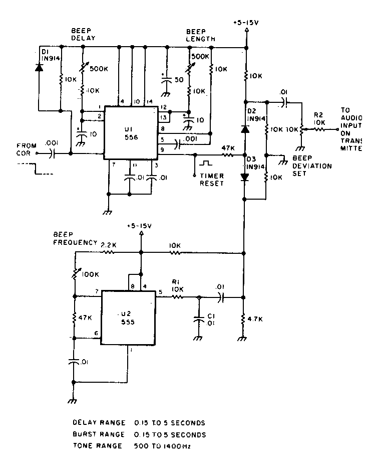 Este circuito foi encontrado em documentação para radioamadores dos anos 80. Trata-se do denominado rooger-beep que é o bip que se transmite quando se troca a função falar-ouvir.