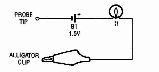 Este provador de continuidade muito simples usa uma pequena lâmpada de 1,5 V (tipo usado em lanternas). Pode ser modificado para usar LEDs, com alimentação de 3 V.