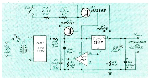 Encontramos este circuito na revista Radio Electronics de março de 1991. O circuito integrado e o transistor de potência devem ser dotados de radiadores de calor.