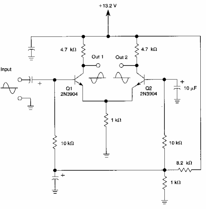 Este circuito fornece sinais em fase com a entrada e também com a fase invertida. O circuito foi encontrado numa documentação dos anos 90. Os transistores são de uso geral.