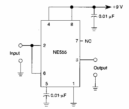 Este simples circuito disparador foi encontrado numa documentação americana dos anos 90. O circuito integrado é o 555