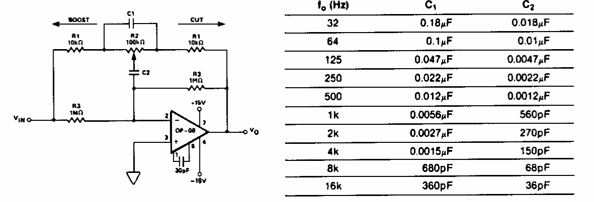 Encontrado em documentação da Precision Monolithics dos anos 90, este circuito equaliza sinais de oitava determinada pelos valores dos capacitores conforme tabela junto ao diagrama.