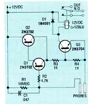 Com 3 transistores, este sensível circuito foi encontrado na revista Radio Electronics de julho de 1990. A alimentação é de acordo com a tensão do relé utilizado.